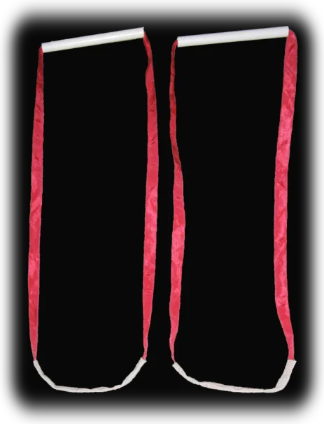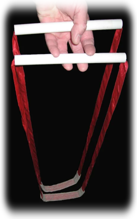 A pair of straps made from 25mm webbing with stiff plastic tube handles and lead weighted anti-slip rubber mesh pads for passing under the hull. The anti-slip pads ensure the hull stays secure in the straps when lifting out of the water as plain webbing is prone to slipping off the hull.