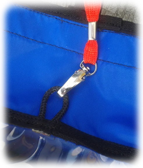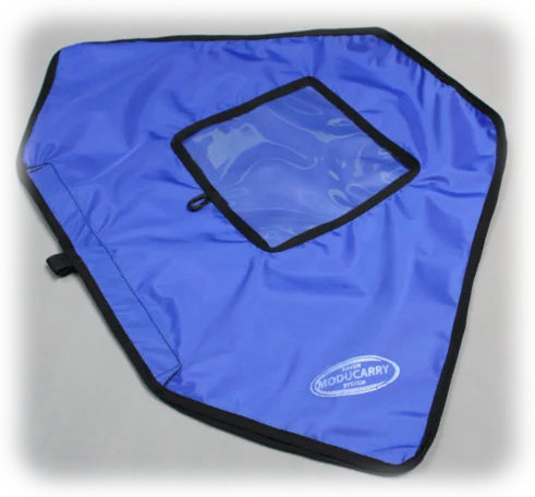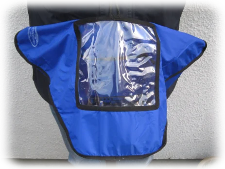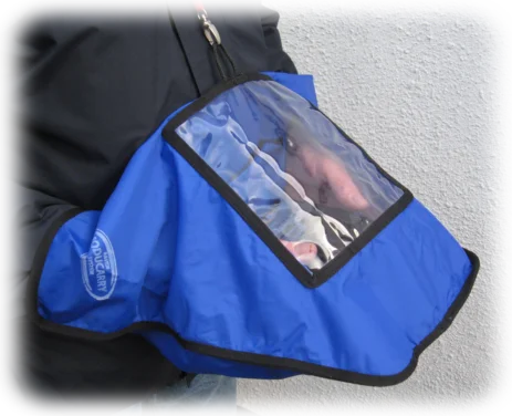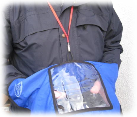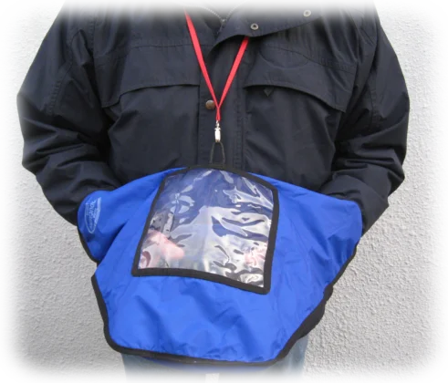 The mitt completely encloses your transmitter, with shaped openings on either side for your hands, and has a clear plastic window on the top so you can see the meter, display, and trims. The mitt closes with Velcro and also has a small antenna hole at the front. The mitt is designed to be held, rather than hung from a neck strap, but there is also a neck strap attachment loop that allows attaching a neck strap to the outside of the mitt. This allows the strap to be attached without having a hole in the top of the mitt that lets the rain drip in. The mitt is designed so that the transmitter cannot drop out of it when using a neck strap, even if you take your hands out of it with the rear Velcro closure open.